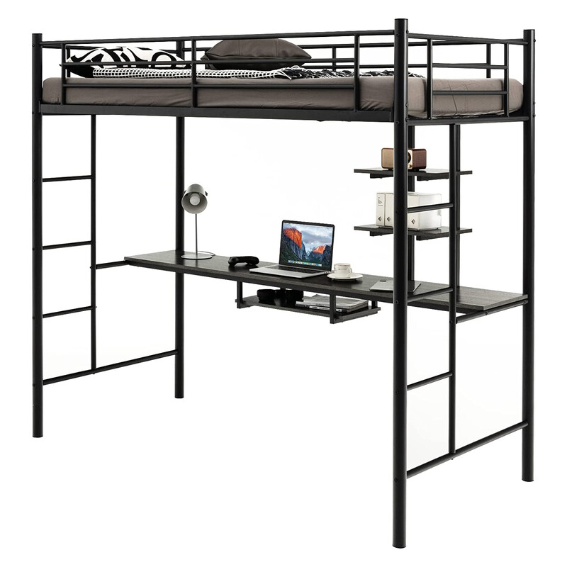 Loftsäng i metall med skrivbord och säkerhetsräcken svart
