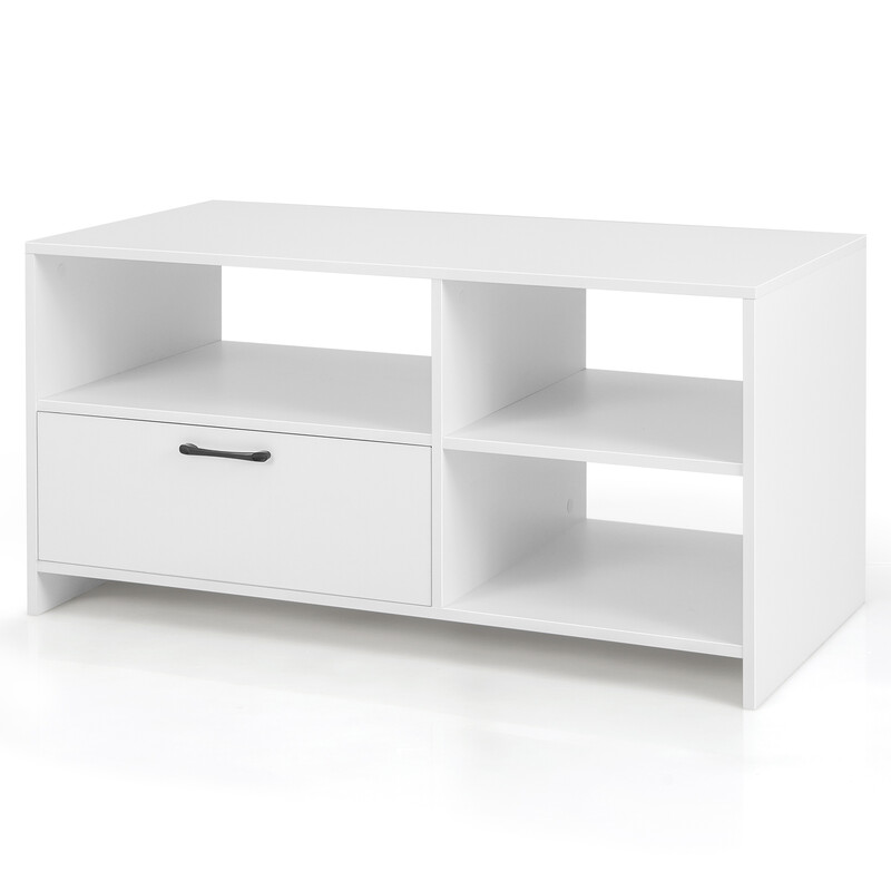 Tv-bänk med öppna fack och låda för tv upp till 50 tum, vit design