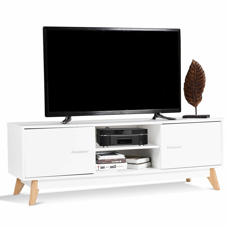 Tv-bord för 60-tums tv med förvaring och massiva träben i vit design